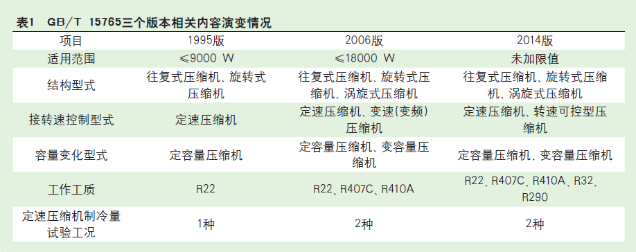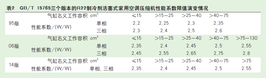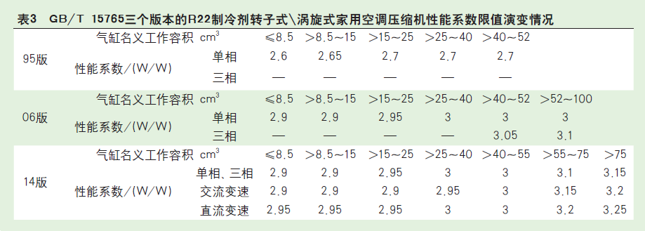 (1)1995年GB/T 15765首次制定時(shí),由于沒有國際同類國家標(biāo)準(zhǔn)或國際相關(guān)標(biāo)準(zhǔn),在充分調(diào)研的基礎(chǔ)上,綜合了國內(nèi)外空調(diào)壓縮機(jī)行業(yè)的產(chǎn)品技術(shù)指標(biāo)水平,確定了產(chǎn)品性能系數(shù)限值。