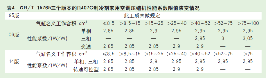 如表4所示,標(biāo)準(zhǔn)1995版沒有對R407C制冷劑家用空調(diào)壓縮機(jī)性能系數(shù)限值做出規(guī)定。2006版標(biāo)準(zhǔn)綜合了國內(nèi)外家用空調(diào)壓縮機(jī)行業(yè)使用R407C制冷劑生產(chǎn)產(chǎn)品的技術(shù)指標(biāo)水平,劃分了R407C制冷劑家用空調(diào)壓縮機(jī)的氣缸名義工作容積區(qū)間,確定了不同電源種類的R407C制冷劑家用空調(diào)壓縮機(jī)性能系數(shù)限值,該限值具有一定先進(jìn)水平。