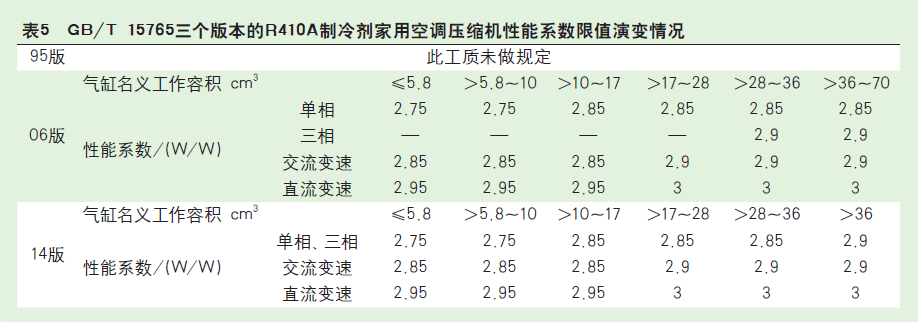 2014版將“…實(shí)測性能系數(shù)…規(guī)定限值的95%?!备臑椤啊瓕?shí)測性能系數(shù)…規(guī)定限值?!痹摳膭邮窃?995版的基礎(chǔ)上,再次將R410A制冷劑家用空調(diào)壓縮機(jī)能效系數(shù)普遍提升了5%。