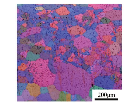 某空調(diào)器鋁合金導(dǎo)風(fēng)板成形弧面的模型如圖1所示,其成形部分的尺寸為90mm×40mm×16mm,整體外觀呈不規(guī)則球面。零件所用材料為6063-T5型材,其厚度為1.1mm。采用Tescan MAR3場發(fā)射電子顯微鏡配帶的電子背散射衍射探頭對其表面形貌、晶粒取向進(jìn)行了表征,表征面與擠壓方向垂直,顯微組織如圖2所示,其平均晶粒尺寸約為53μm,內(nèi)部有明顯動(dòng)態(tài)再結(jié)晶行為,有利于消除加工硬化、材料內(nèi)應(yīng)力,提高材料的加工性能。