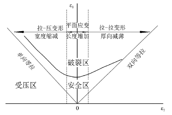 成形極限圖(FLD)是由一系列的極限應(yīng)變點(diǎn)構(gòu)成的,通常用于定量的評價(jià)板料在不同加載路徑下成形時(shí)的極限變形情況,它給出從單拉到雙拉各種應(yīng)變路徑下板料的極限主應(yīng)變。成形極限圖是評定和判斷板材成形性能最直接和最綜合的方法,它是評價(jià)板材成形性能好壞和解決板材沖壓問題的有效工具[7]。成形極限圖如圖5所示[8],ε1表示主應(yīng)變,ε2代表次應(yīng)變。板材在成形過程中一般存在兩種成形極限,破裂和起皺。起皺主要是拉-壓和壓-壓兩種應(yīng)力狀態(tài)作用的結(jié)果,可通過優(yōu)化工藝、增加壓邊力解決,但壓邊力過大會(huì)導(dǎo)致板料破裂,因此板料破裂失穩(wěn)成為最常見的失效形式[9]。