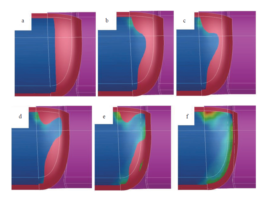 成形起皺過程分析如圖6所示,圖6中e、f起皺非常嚴(yán)重,原因是b、c、d過程中零件懸空,金屬流動(dòng)未受到有效的限制,導(dǎo)致起皺區(qū)域擠料。零件與模具接觸的演變過程如圖7所示,材料與模具接觸并非平滑過渡,起皺區(qū)域呈V字型閉合。綜上,導(dǎo)風(fēng)板在塑性變形過程中,型材處于徑向、環(huán)向受壓,中間懸空的復(fù)雜狀態(tài),成形時(shí)未能有效限制材料的流動(dòng),從而導(dǎo)致起皺的產(chǎn)生。仿真結(jié)果表明,起皺部分集中在零件下半部分,上半部分成形時(shí)零件與模具平滑過渡,未出現(xiàn)起皺現(xiàn)象,其與模具實(shí)際加工的結(jié)果吻合,采用分布成形法能有效改善起皺現(xiàn)象。一次成形與分布成形得到的零件對比如圖8所示,一次成形有較大起皺(如圖8中圈起部分),而分布成形的零件起皺現(xiàn)象明顯改善。