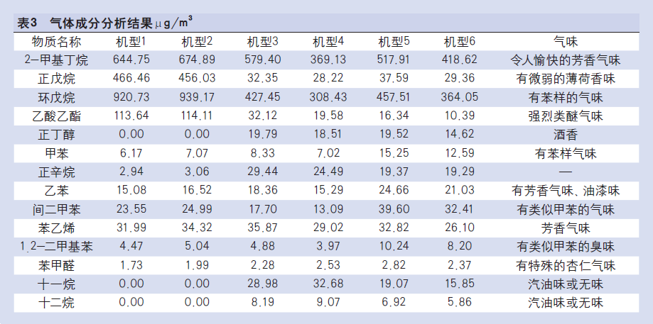 6款機型的氣體成分分析結果如表3所示。由表3看出,新冰箱內含有的氣體種類有烷烴類、苯類、醛類和酯類。2-甲基丁烷、正戊烷和環(huán)戊烷的含量最高,一般用作發(fā)泡劑,主要來源于EPS防護泡沫材料;此外,冰箱用聚氨酯發(fā)泡材料雖然有內膽阻隔,但不排除氣體分子通過拼接處擴散,也有可能是來源之一。乙酸乙酯、苯乙烯、甲苯、乙苯、間二甲苯等成分含量次之,這些物質都是重要的有機化工原料和工業(yè)溶劑,主要來源于冰箱內的塑料部件和膠黏材料[2][3],如HIPS內膽、ABS內膽、EPS泡沫、TPP膠帶、PE膠帶等。