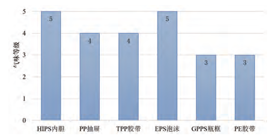 為了進一步地了解新冰箱的氣味來源,本文選擇了一款冰箱進行各部件的氣味評價,具體包括HIPS內膽、PP抽屜、TPP膠帶、EPS泡沫、GPPS瓶框和PE膠帶,將部件按整機容積與使用重量等比例縮小至500mL玻璃瓶,在70℃、2h環(huán)境下激發(fā),由嗅辨員按表1進行氣味等級的評定,結果如圖1所示。