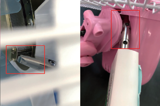 該項(xiàng)目不合格主要集中在兩個(gè)方面:一方面是B型試驗(yàn)探棒通過(guò)搖頭機(jī)構(gòu)、網(wǎng)罩開(kāi)孔能直接觸及到僅由基本絕緣防護(hù)的電機(jī)金屬外殼(如圖1所示);另一方面是在取下可拆卸部件(如開(kāi)關(guān)旋鈕、搖頭拉桿)后,B型試驗(yàn)探棒能直接觸及帶電部件。上述兩種情況都可能造成用戶在使用、清潔和維護(hù)保養(yǎng)器具時(shí)意外觸電。