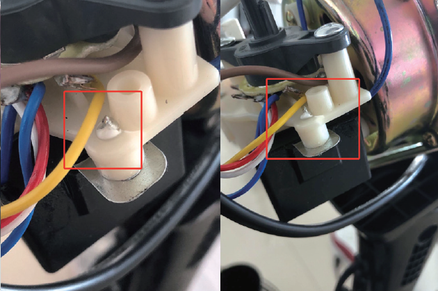 該項(xiàng)目不合格的原因主要是內(nèi)部軟線未進(jìn)行有效固定,軟線能觸及自攻螺釘尖端,在日常使用過(guò)程中,可能造成電源軟線絕緣層破損,導(dǎo)致觸電事故的發(fā)生(如圖2所示)。