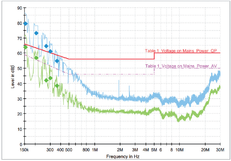 該項(xiàng)目不合格是端子騷擾電壓測(cè)量結(jié)果超過(guò)標(biāo)準(zhǔn)限值(如圖3所示),會(huì)影響產(chǎn)品在使用過(guò)程中的穩(wěn)定性和可靠性,同時(shí)還會(huì)通過(guò)電源線將電磁干擾傳遞到同一供電網(wǎng)絡(luò)上的其他用電設(shè)備,導(dǎo)致其他設(shè)備無(wú)法正常工作或降低工作質(zhì)量,造成電磁污染。