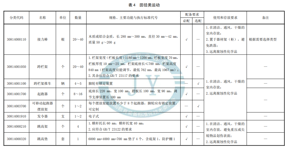 標準對體育器材的數(shù)量、規(guī)格、功能、配備要求及使用和存放要求作出規(guī)定。