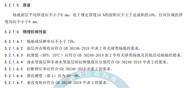 耐人工氣候老化性能、無機填料及高聚物的含量、面層成品和原料中有害物質(zhì)限量及氣味應(yīng)符合新國標GB 36246-2018《中小學(xué)合成材料面層運動場地》的要求。