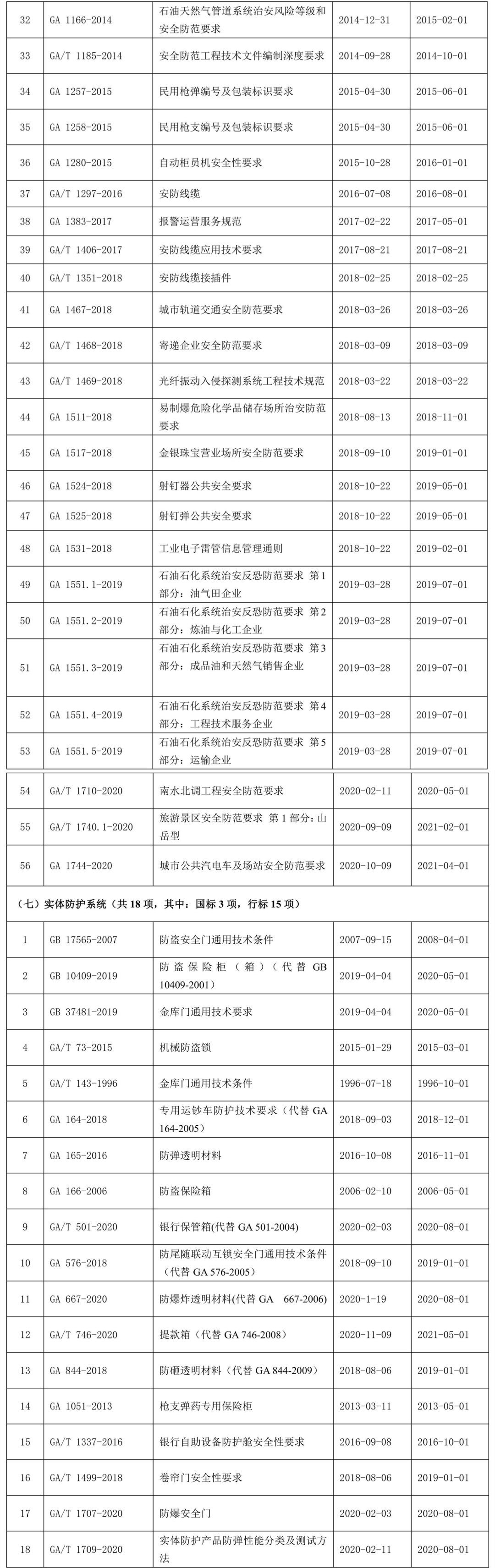 2020年,SAC/TC100在編的國家標(biāo)準(zhǔn)和行業(yè)標(biāo)準(zhǔn)共70余項。截止年底,已完成并經(jīng)批準(zhǔn)發(fā)布的標(biāo)準(zhǔn)共23項,其中國家標(biāo)準(zhǔn)2項,行業(yè)標(biāo)準(zhǔn)共21項。全年,SAC/TC100積極推進公共安全視頻監(jiān)控應(yīng)用云平臺項目標(biāo)準(zhǔn)編制工作,根據(jù)公安部公共安全視頻監(jiān)控應(yīng)用云平臺項目標(biāo)準(zhǔn)編制工作的相關(guān)要求,啟動了20項公共安全行業(yè)標(biāo)準(zhǔn)的制修訂工作,完成了10項標(biāo)準(zhǔn)報批稿,其中2項標(biāo)準(zhǔn)已經(jīng)公安部批準(zhǔn)發(fā)布。同時,SAC/TC100配合社會治安防控和反恐怖工作開展國家重點專項研究,積極推進承擔(dān)的反恐國家重點專項的課題研究工作,翻譯國外反恐文獻10余冊,制定2項公共安全行業(yè)標(biāo)準(zhǔn),完成2項研究報告。在國際標(biāo)準(zhǔn)化方面,組織我國專家牽頭制定1項國際標(biāo)準(zhǔn)ITU-T H.627:2020《視頻監(jiān)控系統(tǒng)的信令和協(xié)議》,牽頭制定的9項國際標(biāo)準(zhǔn)均已正式發(fā)布實施,其中國際電工委員會(IEC)國際標(biāo)準(zhǔn)6項,國際電信聯(lián)盟(ITU)國際標(biāo)準(zhǔn)3項?,F(xiàn)將全國安全防范報警系統(tǒng)標(biāo)準(zhǔn)化技術(shù)委員會現(xiàn)行標(biāo)準(zhǔn)目錄公布如下: