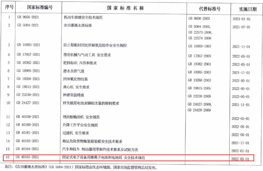 日前,市場監(jiān)管總局(國家標(biāo)準(zhǔn)委)批準(zhǔn)發(fā)布了《機動車玻璃安全技術(shù)規(guī)范》等16項強制性國家標(biāo)準(zhǔn)。其中包括GB 40165-2021《固定式電子設(shè)備用鋰離子電池和電池組 安全技術(shù)規(guī)范》,并且將于2022年5月1日實施。具體內(nèi)容如下: