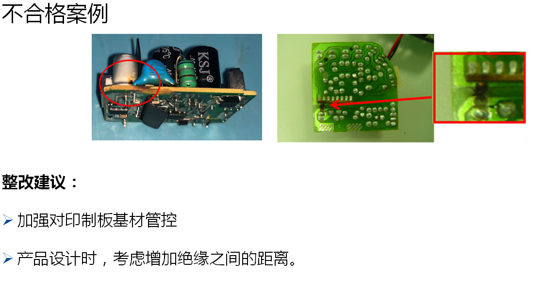 常見(jiàn)問(wèn)題及提升方案:電源適配器在經(jīng)歷潮態(tài)試驗(yàn)后,初次級(jí)之間PCB板上被高壓擊穿;建議在生產(chǎn)過(guò)程中選擇更耐濕熱的PCB板基材,變壓器內(nèi)部或PCB板增加絕緣距離、絕緣擋片等工藝進(jìn)行生產(chǎn)。