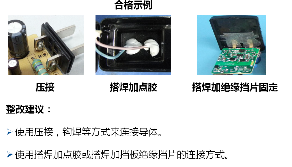 (1)次級(jí)輸出引線僅錫焊在PCB板上不滿足GB4943.1-2011條款3.1.9要求,僅使用錫焊連接導(dǎo)線,無(wú)其它附加措施。建議在PCB板上穿孔鉤焊。