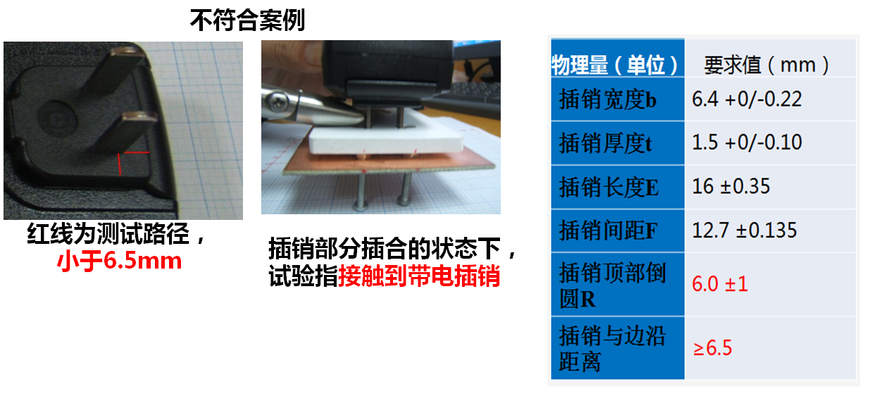 常見(jiàn)問(wèn)題及提升方案:電源適配器的插銷距邊沿距離小于6.5mm;插銷部分插合時(shí),試驗(yàn)指觸及插銷;不滿足GB 4943.1-2011標(biāo)準(zhǔn)第4.3.6條要求;建議改進(jìn)外殼開(kāi)模形狀,插銷距離邊緣距離滿足大于6.5mm。