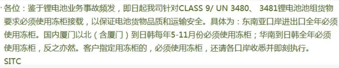 近期由于鋰電池運(yùn)輸過程中屢次出現(xiàn)各類危險(xiǎn)性事故, 山東海豐國際船務(wù)公司SITC通知, 即日起對(duì)Class 9/UN 3480, UN3481鋰電池組以及裝有鋰電池的設(shè)備等貨物必須使用冷藏貨柜運(yùn)輸。