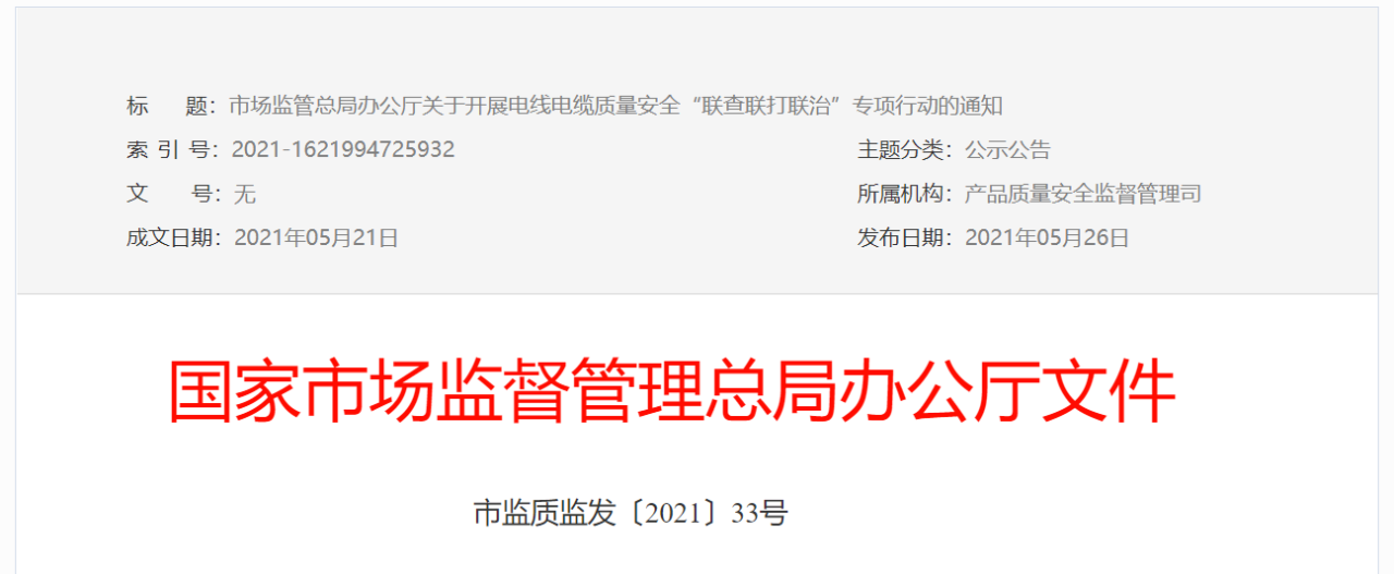電線電纜是涉及國計民生的重要工業(yè)產(chǎn)品。近年來,全國市場監(jiān)管系統(tǒng)持續(xù)開展電線電纜生產(chǎn)企業(yè)專項整治,行業(yè)秩序日趨規(guī)范,質(zhì)量水平穩(wěn)步提升,但還存在流通領域不合格問題突出、導體電阻等重要指標不符合標準要求、偷工減料生產(chǎn)“打折”電纜時有發(fā)生等問題。為進一步促進電線電纜行業(yè)持續(xù)健康發(fā)展,保障人民群眾生產(chǎn)生活放心安穩(wěn),市場監(jiān)管總局決定聚焦電線電纜產(chǎn)品質(zhì)量問題突出的重點區(qū)域、重點品種、重點問題,開展電線電纜質(zhì)量安全“聯(lián)查聯(lián)打聯(lián)治”專項行動。