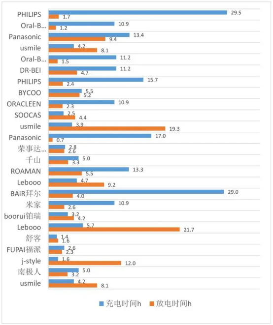 有23款電動(dòng)牙刷樣品標(biāo)注了充電時(shí)間,2款未標(biāo)注。在23款標(biāo)注了充電時(shí)間的電動(dòng)牙刷中,有2款樣品的實(shí)際充電時(shí)間超過了標(biāo)稱的最大時(shí)間。25款電動(dòng)牙刷中,實(shí)際充電時(shí)間最短為1.4小時(shí),最長(zhǎng)為29.5小時(shí)。