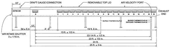 ASTM E84的測試設備是一個隧道爐,長約7.6m,詳見下圖。