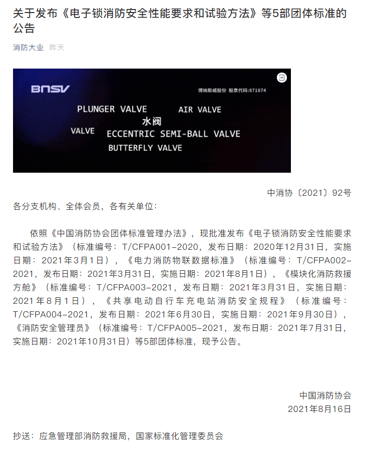 近日,根據(jù)微信公眾號消防大業(yè)公布消息稱,依照《中國消防協(xié)會團(tuán)體標(biāo)準(zhǔn)管理辦法》,現(xiàn)批準(zhǔn)發(fā)布《電子鎖消防安全性能要求和試驗方法》(標(biāo)準(zhǔn)編號:T/CFPA001-2020,發(fā)布日期:2020年12月31日,實施日期:2021年3月1日)在內(nèi)的5部團(tuán)體標(biāo)準(zhǔn)。