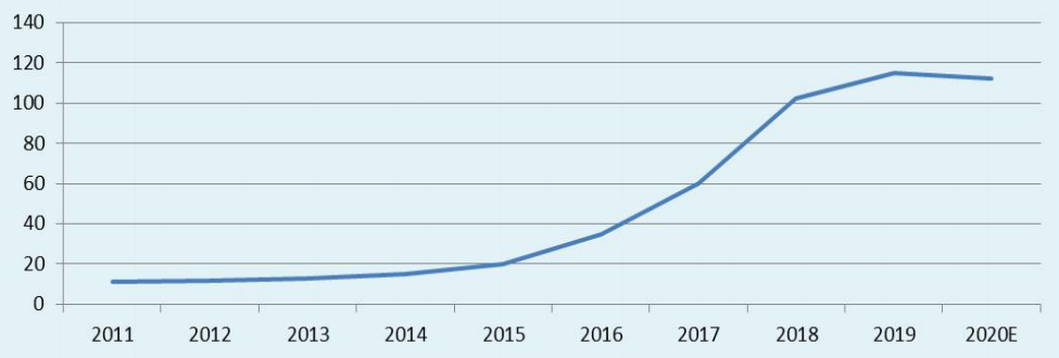 圖2 近十年智能門(mén)鎖工業(yè)總產(chǎn)值變化示意圖(單位:億元)