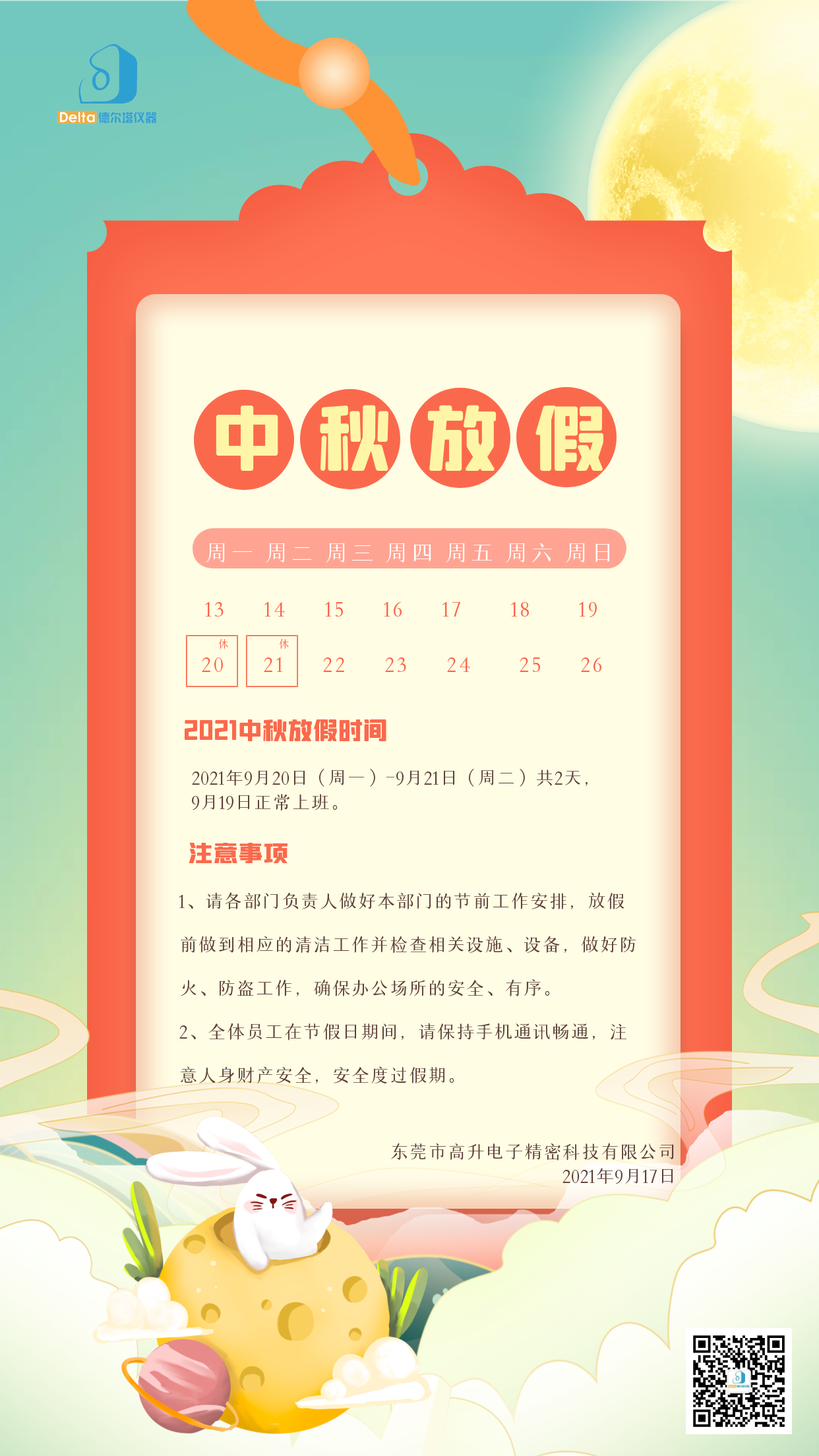 您好!秋風(fēng)送爽,金桂飄香。在繁忙的工作中,我們即將迎來(lái)中秋佳節(jié),借此機(jī)會(huì),Delta德?tīng)査x器全體員工,祝您及家人節(jié)日愉快,合家歡樂(lè)!