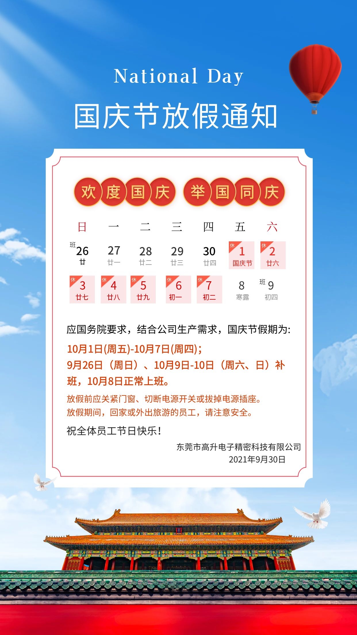 熱烈祝賀中華人民共和國成立72周年,盛世華誕,舉國同慶。根據(jù)國務(wù)院辦公廳《關(guān)于2021年國慶節(jié)假日安排的通知》精神,結(jié)合公司實(shí)際生產(chǎn)需要,現(xiàn)將我司2021年國慶節(jié)放假安排通知如下: