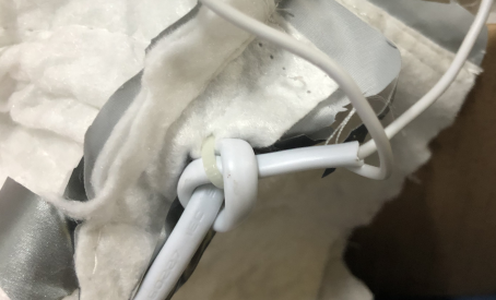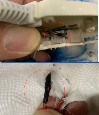 電熱毯中的發(fā)熱線和內部線在進行25000周期的彎曲試驗中,未達到彎曲次數(shù),內部發(fā)熱線已經斷裂,不符合標準GB 47-6.1-2005和GB 4706.8-2008第21.111.1條款“樣品不能損壞”的要求。