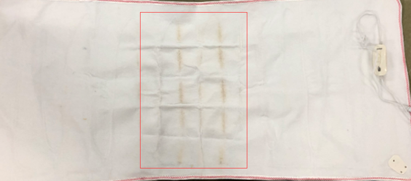 電熱毯進行折疊后的發(fā)熱試驗時,測得發(fā)熱元件表面溫升為151.2K(限值:≤145K)毯體表面熔損和焦化,不符合GB 4706.1-2005和GB 4706.8-2008標準第19.106條款的要求。