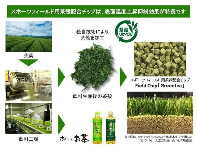 日本飲料制造公司伊藤園以獨(dú)家“茶渣回收”技術(shù),與運(yùn)動(dòng)品牌美津濃(mizuzo)合作開(kāi)發(fā)的人造草坪材料GREEN TEA,應(yīng)用于帝京長(zhǎng)岡高等學(xué)校的足球場(chǎng)。