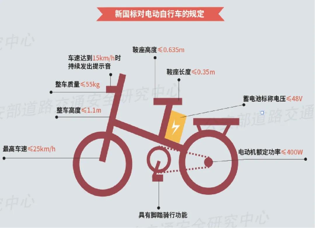 電動自行車現(xiàn)行國家強制性標(biāo)準(zhǔn)為GB 17761-2018《電動自行車安全技術(shù)規(guī)范》,于2019年4月15日正式實施,新標(biāo)準(zhǔn)從整車安全、機械安全、電氣安全、防火性能、阻燃性能、無線電騷擾特性和使用說明書這7個方面出發(fā),對“整車標(biāo)志、車速限值、制動性能、整車質(zhì)量、腳踏騎行能力、尺寸限值、結(jié)構(gòu)、車速提示音、淋水涉水性能、車架/前叉組合件、把立管和鞍管、反射器、照明和鳴號裝置、電氣裝置、控制系統(tǒng)、充電器與蓄電池、防火性能、阻燃性能、無線電騷擾特性、使用說明書”這20項做出了規(guī)定。相較于舊版標(biāo)準(zhǔn),新標(biāo)準(zhǔn)規(guī)定了電動自行車最高行駛速度不得超過25km/h,整車質(zhì)量不大于55kg,蓄電池標(biāo)稱電壓不大于48V,電機功率不大于400W,鞍座長度不大于350mm,行駛車速達到15km/h時應(yīng)持續(xù)發(fā)出提示音,充電線路和電池輸出端應(yīng)裝有短路保護裝置,主要線路和裝置的材料應(yīng)具有防火性能等諸多保障消費者行駛安全和使用安全的關(guān)鍵指標(biāo)。新標(biāo)準(zhǔn)的制定,對電動自行車的定義也更加明確,即“自行車”、屬于非機動車類別。