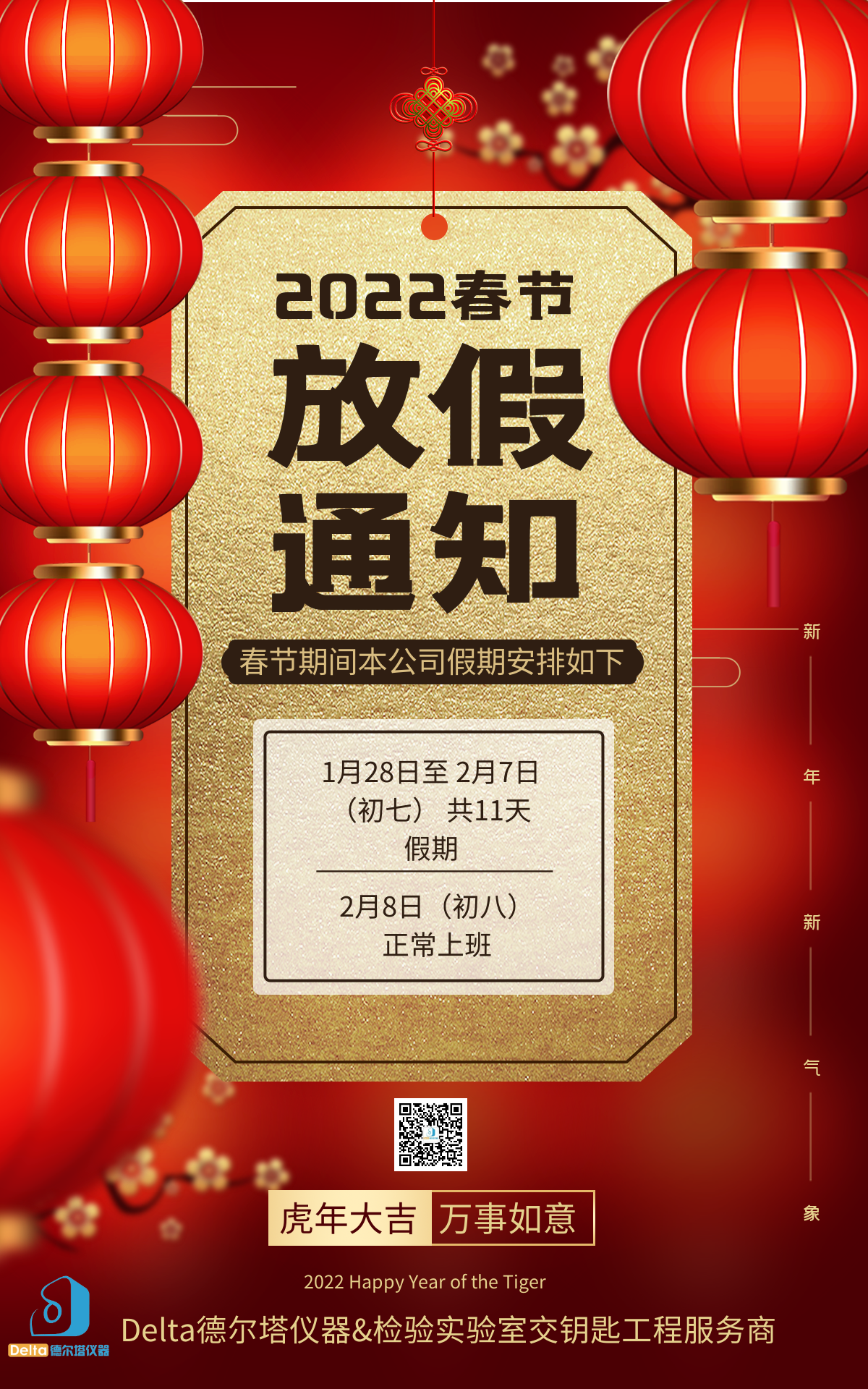 根據(jù)國務(wù)院辦公廳通知精神,結(jié)合公司實(shí)際情況,現(xiàn)將2022年春節(jié)放假安排通知如下:1月28日至2月7日放假調(diào)休,共11天。2月8日正常上班。預(yù)祝大家新年快樂,虎年大吉,闔家幸福!