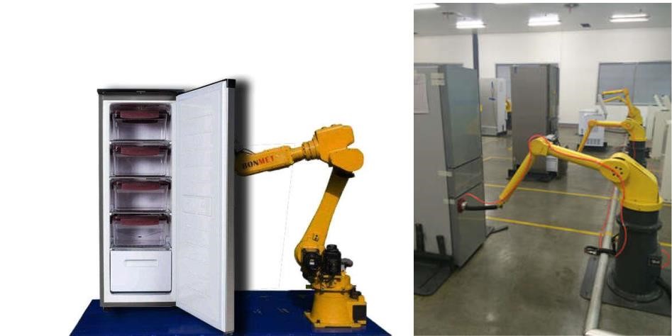 家用電器門開關(guān)壽命耐久性測(cè)試系統(tǒng)能夠符合 IEC60335-1/GB4706.1《家用和類似用途電器的安全第 1 部分 :通用要求》、IEC60335-2-24:2007/GB 4706.13-2014 《家用和類似用途電器的安全 制冷器具、冰淇淋機(jī)和制冰機(jī)的特殊要求》、IEC60335-2-7/GB4706.24-2008《家用和類似用途電器的安全 洗衣機(jī)的特殊要求》以及 GB/T 8059-2016《家用和類似用途制冷器具》標(biāo)準(zhǔn)中第10章節(jié)“門、蓋和抽屜的耐久性試驗(yàn)”等要求。本測(cè)試系統(tǒng)是根據(jù)各類電冰箱、洗衣機(jī)、微波爐、烤箱、消毒柜的門鎖扣及鉸鏈的使用壽命的標(biāo)準(zhǔn)測(cè)試要求而設(shè)計(jì)制造的一款智能機(jī)器人自動(dòng)測(cè)試設(shè)備,系統(tǒng)你那個(gè)根據(jù)被測(cè)冰箱、洗衣機(jī)的不同規(guī)格要求,靈活并全面地進(jìn)行各類指標(biāo)設(shè)置、動(dòng)作模擬。