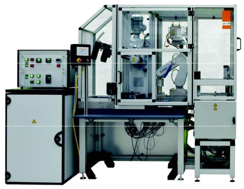 智能機(jī)器人全自動(dòng)沖擊系統(tǒng)的結(jié)構(gòu)如圖所示,由機(jī)器人對(duì)沖擊試樣的參數(shù)進(jìn)行設(shè)定:試驗(yàn)時(shí)間(從冷卻環(huán)境到完成沖擊)小于4.5s;沖擊試樣缺口對(duì)稱面偏離砧座中點(diǎn)不大于0.1mm(行業(yè)要求不大于0.5mm)。試驗(yàn)完成后,系統(tǒng)會(huì)得出沖擊試樣是否合格的結(jié)果。