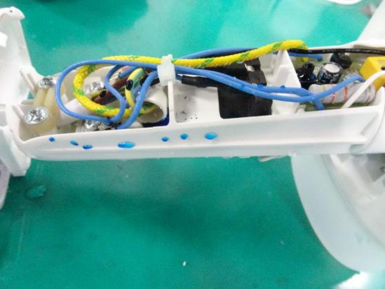 IPX4濺水后拿在手上進行最大幅度的搖晃后,擦干器具表面所有殘留水跡,再小心拆開檢查,發(fā)現(xiàn)試樣內(nèi)部部分元器件以及電線等絕緣體表面存在肉眼可見的水跡,經(jīng)過對樣品內(nèi)水跡部位仔細查看,部分水跡使樣品內(nèi)的爬電距離和電氣間隙降低至低于第29章的要求,結(jié)果判定為不合格。