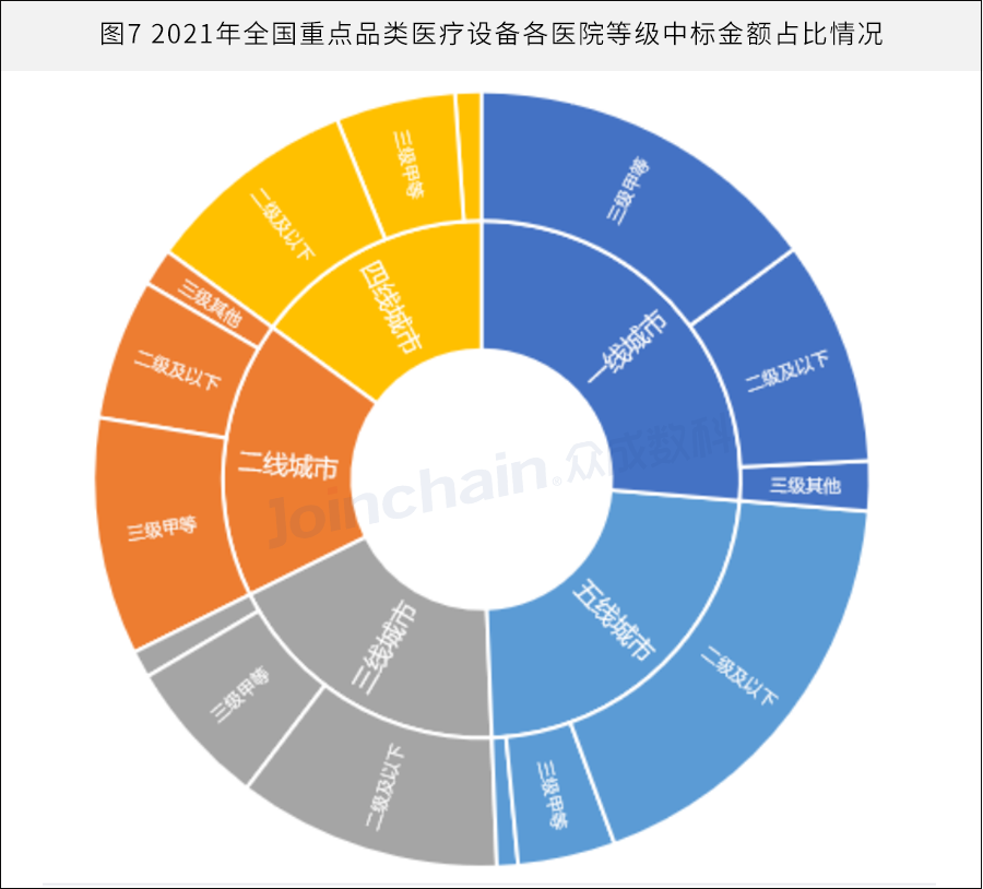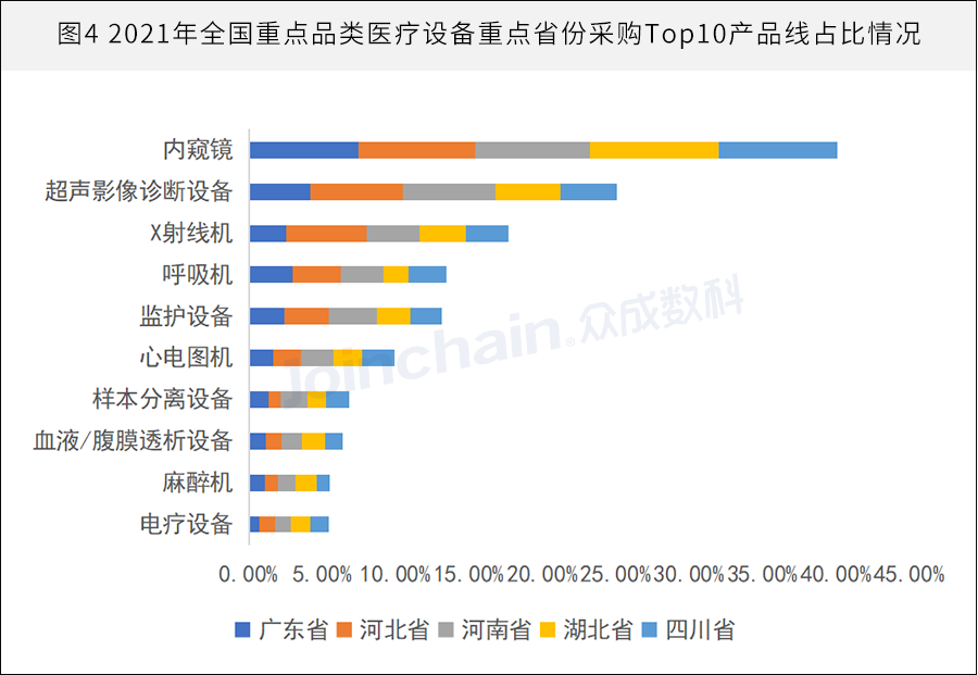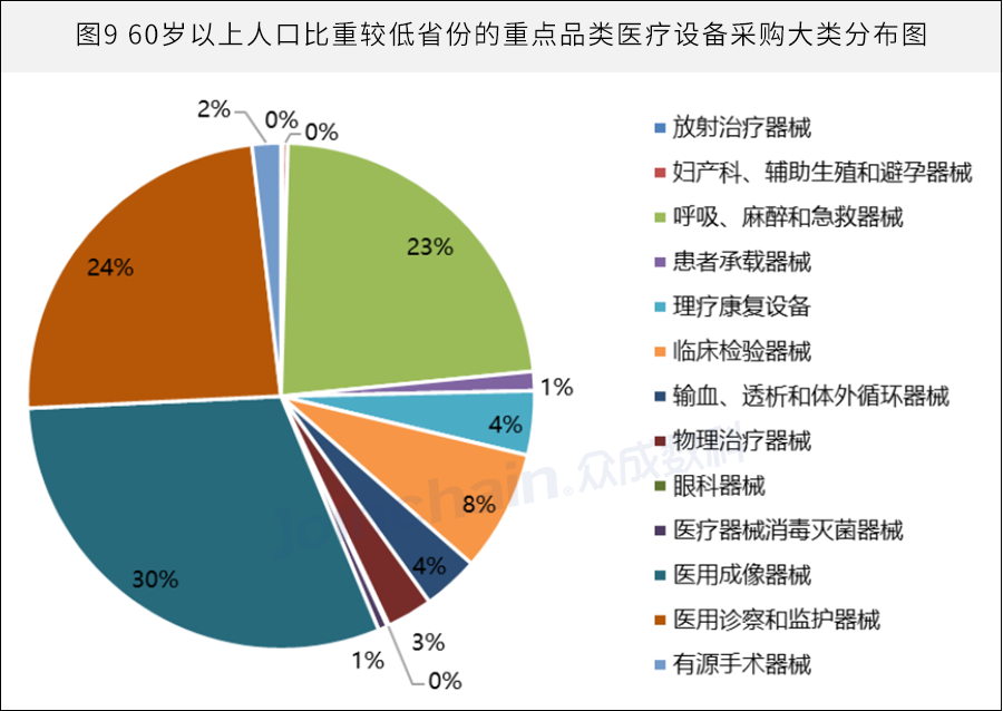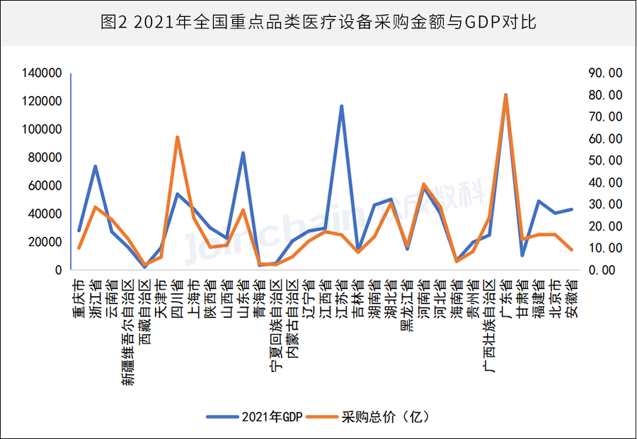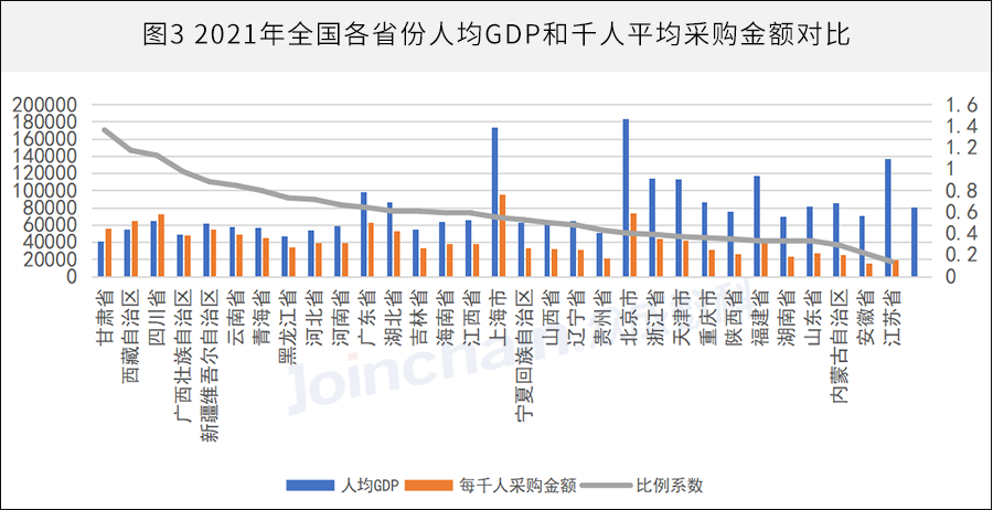 哪些省份采購飽和度較低?2021年全國重點(diǎn)品類醫(yī)療設(shè)備的每千人均采購金額為42065.22元,其中安徽省、江蘇省、貴州省、湖南省、內(nèi)蒙古自治區(qū)、陜西省和山東省7省份的每千人采購金額不足30000元;與各省份人均GDP進(jìn)行交叉比對,如下圖,上述7省份每千人采購金額與人均GDP的比例系數(shù)都維持在較低水位,不足0.4,遠(yuǎn)低于平均水平,這表明這些地區(qū)的醫(yī)療設(shè)備市場空間遠(yuǎn)沒有達(dá)到飽和,有較大的潛力。