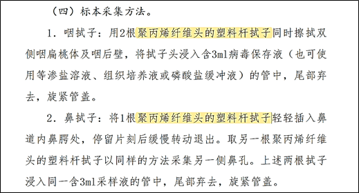 我們都知道采樣拭子是直接接觸采樣部位的,也就是直接接觸我們的人體器官的,采樣頭的材質(zhì)和后續(xù)的檢測(cè)相關(guān)密切。再來(lái)看看國(guó)家衛(wèi)健委《新冠肺炎實(shí)驗(yàn)室檢測(cè)技術(shù)指南(第三版)》中的規(guī)范要求: