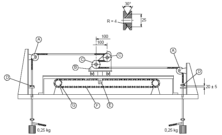 21.111.1 把發(fā)熱元件或內(nèi)部布線的樣品連接到如圖111所示的設(shè)備上,此設(shè)備有一個帶兩個輪子的滑車,每個輪子上都有一個半徑為4mm的槽,槽底的直徑為25mm,輪子的安放位置應(yīng)能使樣品在它們之間水平通過。