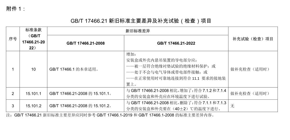 家用和類似用途固定式電氣裝置的電器附件外殼產(chǎn)品強(qiáng)制性認(rèn)證所依據(jù)的GB/T 17466.21-2022《家用和類似用途固定式電氣裝置的電器附件安裝盒和外殼 第21部分:用于懸吊裝置的安裝盒和外殼的特殊要求》、GB/ T17466.23-2022《家用和類似用途固定式電氣裝置的電器附件安裝盒和外殼 第 23部分:地面安裝盒和外殼的特殊要求》標(biāo)準(zhǔn)已于2022年4月15日發(fā)布,并將于2022年11月1日實(shí)施,新版標(biāo)準(zhǔn)自實(shí)施之日起分別代替 GB/T 17466.21-2008 和 GB/T 17466.23-2008標(biāo)準(zhǔn)。