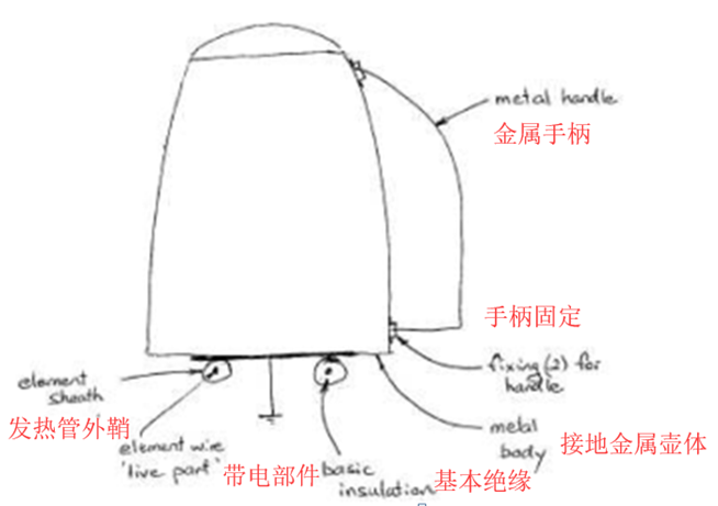 注:電熱水壺金屬手柄與接地的金屬壺體相連。