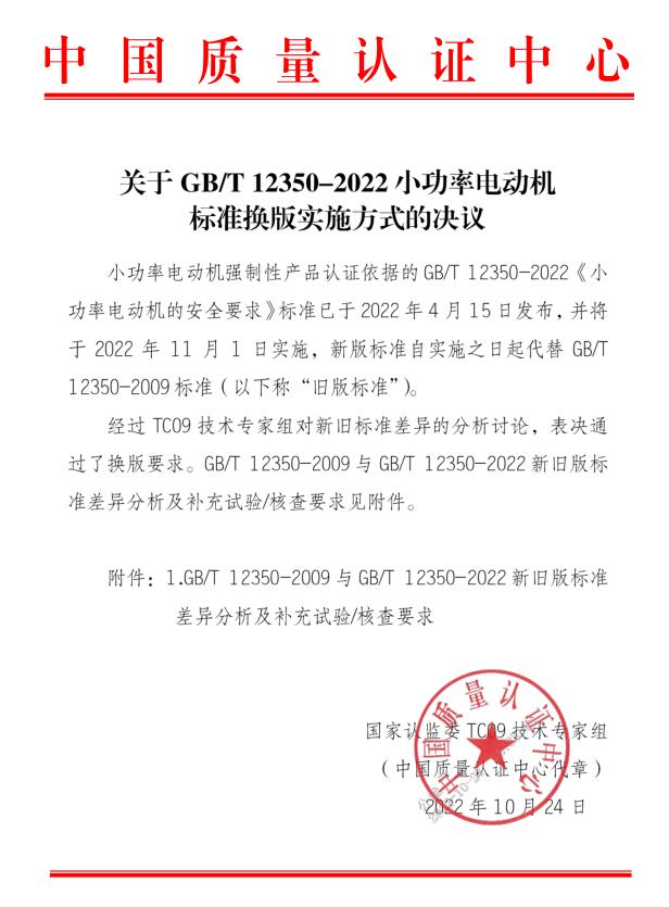 關于GB/T 12350-2022小功率電動機標準換版實施方式的決議