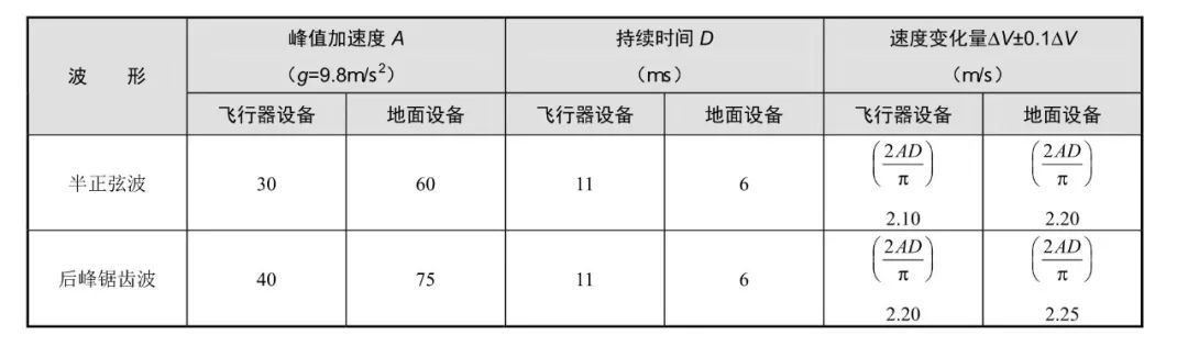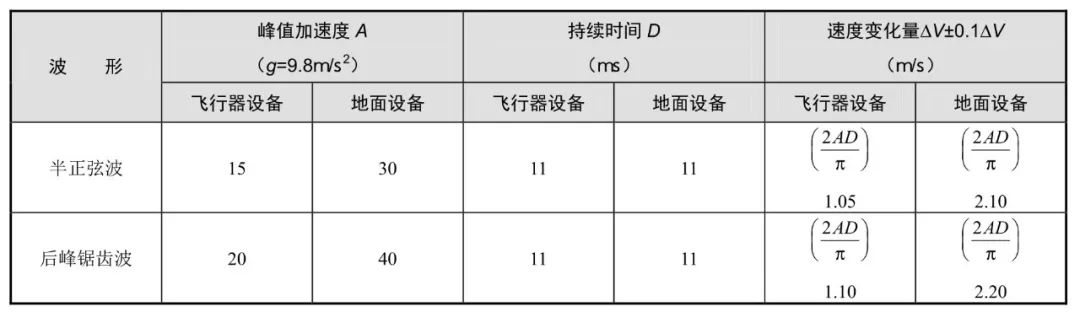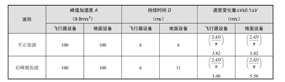 注:① 速度變化量由沖擊脈沖波形積分求得。積分時間從脈沖前0.4D到脈沖后0.1D止,D為沖擊脈沖持續(xù)時間。② 裝在減震器上質(zhì)量小于150kg的飛機設(shè)備應(yīng)優(yōu)先選用后峰鋸齒波。