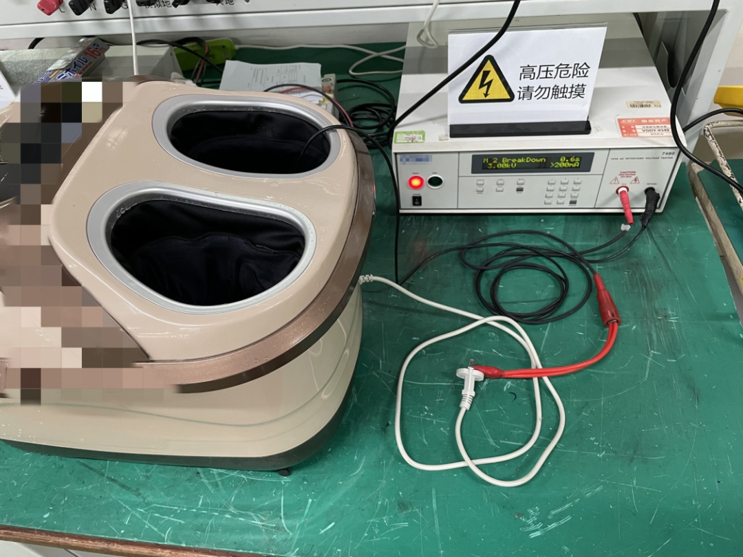 一款銘牌標稱IPX4防水等級的足浴足療按摩一體機,在IPX4試驗后,出現(xiàn)輸入電極L、N對足部按摩區(qū)易觸及表面(加強絕緣)電氣強度試驗3000V擊穿現(xiàn)象,如圖1。不符合GB 4706.1-2005和GB 4706.10-2008標準第15.1條款要求。