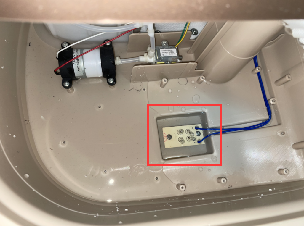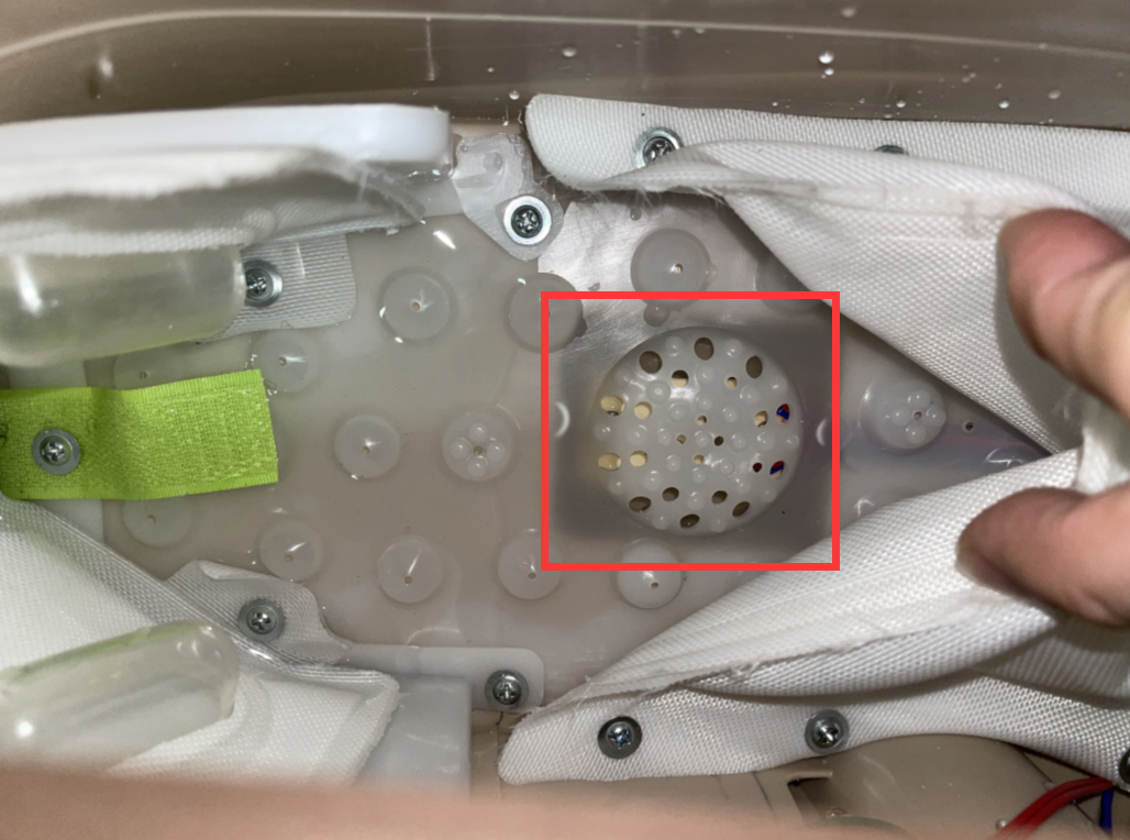 1、IPX4試驗后,開啟器具外殼后發(fā)現(xiàn)有水積聚在樣品的足部按摩區(qū)域無法有效排走,導致積水浸泡了足部按摩區(qū)下的LED燈光電路板,見圖3、圖4,使得LED燈光電路板的電極與足部按摩區(qū)易觸及表面處于導通,形成回路。