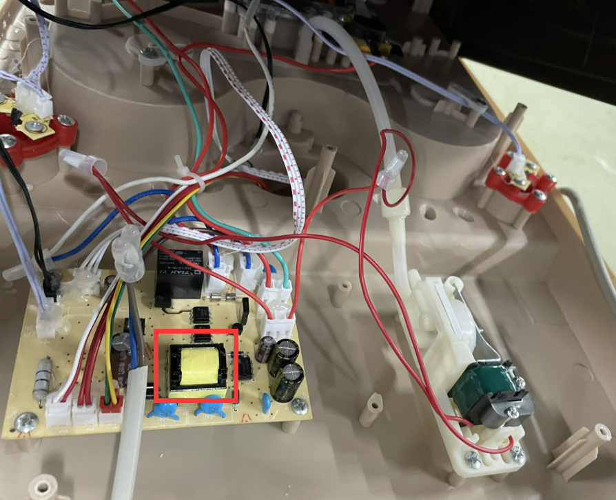 2、通過內(nèi)部結(jié)構(gòu)線路排查,發(fā)現(xiàn)這一部分的線路電壓為5V,屬于安全特低電壓,由主電路板的安全隔離變壓器輸出過來,見圖5。防水試驗前耐壓測試此部位未擊穿,而進水后此部位的耐壓試驗不合格,因此根據(jù)標準分析以及試驗結(jié)果:實際原因為主電路板變壓器的輸入與輸出之間沒有達到安全隔離的加強絕緣要求。