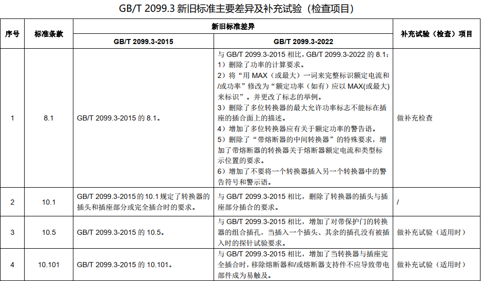 經(jīng)過強制性產(chǎn)品認(rèn)證技術(shù)專家組器具附件組(TC07)對新舊標(biāo)準(zhǔn)的研究分析,表決通過了換版要求。GB/T2099.3一2022標(biāo)準(zhǔn)與GB/T2099.3-2015標(biāo)準(zhǔn)的主要差異及補充試驗(檢查項目)如下。