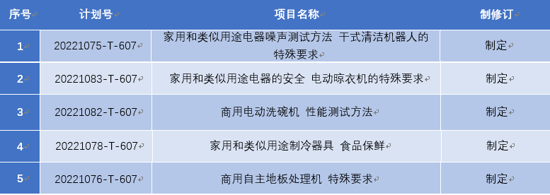 2022年12月,國家標準化管理委員會發(fā)布關(guān)于下達2022年第三批、第四批推薦性國家標準計劃及相關(guān)標準外文版計劃的通知(國標委發(fā)(2022)39號、國標委發(fā)(2022)51號),《家用和類似用途電器噪聲測試方法 干式清潔機器人的特殊要求》(計劃號:20221075-T-607)等家電領(lǐng)域推薦性國家標準計劃項目獲得批準,具體如下。