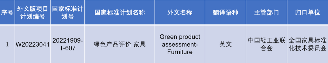 近日,國(guó)家標(biāo)準(zhǔn)化管理委員會(huì)發(fā)布關(guān)于下達(dá)2022年第四批推薦性國(guó)家標(biāo)準(zhǔn)計(jì)劃及相關(guān)標(biāo)準(zhǔn)外文版計(jì)劃的通知(國(guó)標(biāo)委發(fā)【2022】51號(hào))。本批推薦性國(guó)家標(biāo)準(zhǔn)計(jì)劃共計(jì)389項(xiàng),其中包括《保溫材料 壓縮蠕變的測(cè)定》《日用香精中十三種限用香料的測(cè)定-氣相色譜-質(zhì)譜法》等22項(xiàng)輕工領(lǐng)域推薦性國(guó)家標(biāo)準(zhǔn)。本批推薦性國(guó)家標(biāo)準(zhǔn)同步下達(dá)英文版計(jì)劃共計(jì)50項(xiàng),其中包括《綠色產(chǎn)品評(píng)價(jià) 家具》輕工領(lǐng)域國(guó)家標(biāo)準(zhǔn)外文版,具體如下。