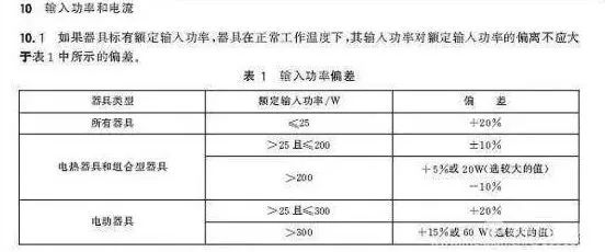 GB 4706.1-2005《家用和類似用途電器的安全 第1部分 通用要求》中對家用電器的輸入功率偏差要求如下: