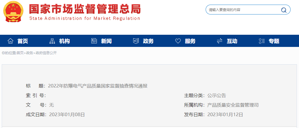 2022年防爆電氣產(chǎn)品質(zhì)量國家監(jiān)督抽查情況通報