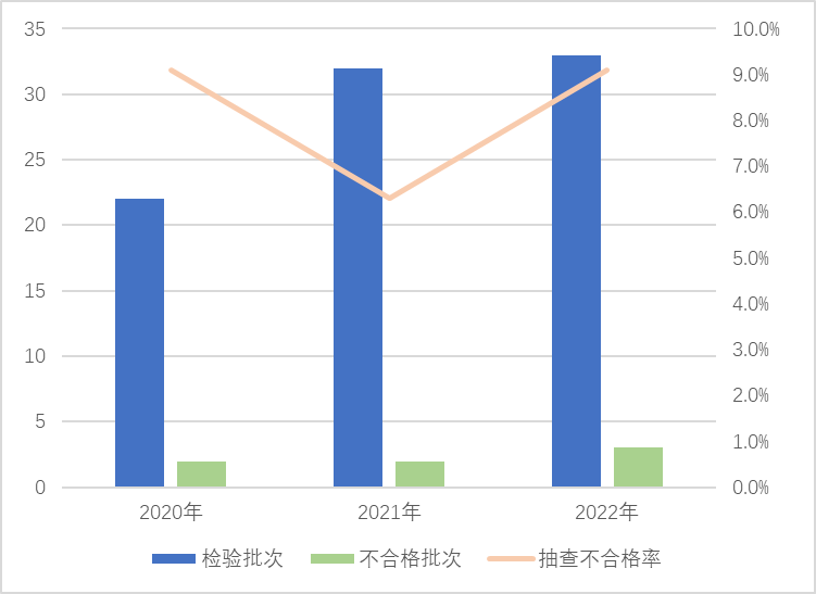 本次抽查10個(gè)?。▍^(qū)、市)30家企業(yè)生產(chǎn)的33批次產(chǎn)品,發(fā)現(xiàn)3批次產(chǎn)品不合格,抽查不合格率為9.1%,較上次抽查上升2.8個(gè)百分點(diǎn)。該產(chǎn)品近3年抽查不合格率分別為9.1%、6.3%、9.1%。